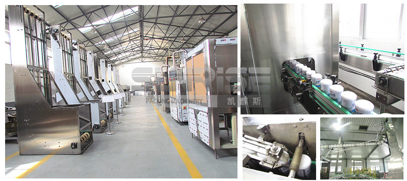 全自動塑料蓋高速壓蓋機(八寶粥、奶粉、龜苓膏等) 我公司生產(chǎn)的全自動壓蓋機由壓蓋與理蓋兩部分組成,可自由調(diào)整安裝位置。采用單道進出罐,可方便與各種輸送機實現(xiàn)對接。該機氣電控制部分采用PLC可編程控制器***控制,電機采用變頻調(diào)速,各重要工位均安裝檢測開關(guān),整機控制靈活簡單,準確可靠,壓蓋成品率可達99%以上。 A.主要技術(shù)參數(shù) 1.生產(chǎn)能力:300-400罐/分鐘 2.總功率:3kw 3.總重量:800kg 4.動力電源:3X380VX50Hz 5.控制電源:DC24V/AC24V 6.壓縮空氣源:0.8Mpa 7.耗氣量:1.6m3/min 8.外形尺寸:壓蓋部分1270mm×870mm×1800mm 理蓋部分1230mm×1000mm×3100mm B.主要結(jié)構(gòu)及特點 1.本機主體采用SUS304不銹鋼材質(zhì),外觀精美,經(jīng)久耐用。 2.本機理蓋器網(wǎng)帶導(dǎo)向及固定機構(gòu)均為我公司自主設(shè)計,網(wǎng)帶邊緣與壓板接觸面積大,網(wǎng)帶運行順暢平穩(wěn),有效防止網(wǎng)帶跳帶。刮板部分與主機襯板貼合緊密,有效提高掛蓋率。整體出蓋率高,速度快,性能可靠。 3.滑道部分采用專利設(shè)計,滑道側(cè)板為SUS304不銹鋼板材,滑道主體采用φ5圓鋼,材質(zhì)為SUS304不銹鋼。減小蓋體行進阻力,杜絕卡蓋擠蓋現(xiàn)象?;涝O(shè)計有固定加強板,提高滑道剛性,不易變形,并加有可調(diào)節(jié)裝置,更好適應(yīng)蓋體尺 4.本機所有與罐體接觸部位均為超高分子聚乙烯、尼龍、橡膠、聚氨酯等軟材料,有效防止罐體劃傷。 5.本機智能化程度高,配有多點檢測裝置,確保主機在無蓋、堵蓋、無罐、倒罐、堵罐等情況下及時停機,保證主機動作準確穩(wěn)定,提高設(shè)備穩(wěn)定性;恢復(fù)正常后,主機自動啟動,提高自動化水平。 6.主機動力部分電機采用變頻控制技術(shù),控制動作***,壓蓋傳動部分采用同步聯(lián)動方式,壓蓋成功率高。 7.主機壓蓋裝置高度可調(diào)節(jié),可滿足不同罐型的壓蓋需求。 8.本機所有氣動元件均采用國內(nèi)知名品牌,壽命長,性能可靠。 9.整機采用西門子PLC自動控制,電機采用臺灣臺達變頻器調(diào)速,所用檢測開關(guān)均采用進口奧托尼克斯品牌。整機自動化程度高,速度快,性能穩(wěn)定。