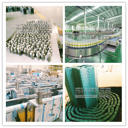 1.側(cè)板為2.5mm厚優(yōu)質(zhì)SUS304,激光切割折彎制作。 2.支腿為50X50不銹鋼方管。 3.支腿支架,護(hù)欄支架均為SUS304沖壓件,外形美觀。 4.集線槽及固定架均為SUS304材質(zhì)。 5.護(hù)欄及墊軌均為鋁合金骨架、高分子聚乙烯耐磨條。 6.連接桿,傳動(dòng)軸均為SUS304不銹鋼材質(zhì),傳動(dòng)軸為40mm軸徑。 7.鏈板采用8.7mm厚進(jìn)口POM材質(zhì)高速鏈板,強(qiáng)度大,壽命長(zhǎng),鏈輪采用進(jìn)口高強(qiáng)度尼龍材質(zhì)。 8.多排變單排鏈道部分采用差速變道,減少罐體擠壓,磨損。 9.操作箱均為SUS304材質(zhì)。 10.傳動(dòng)軸承采用SUS304外罩,帶有防塵裝置。