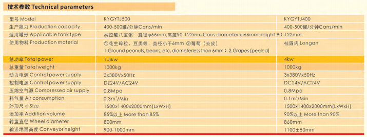 目前國內(nèi)八寶粥易拉罐生產(chǎn)線項目中由于成本和技術(shù)的原因有相當一部分企業(yè)的產(chǎn)品中不添加桂圓與果肉或純手工添加。首先,為了成本不添加桂圓或果肉,短期內(nèi)是為企業(yè)節(jié)省了不少成本,但是就長期而言,對企業(yè)的長期發(fā)展和企業(yè)的品牌帶來的負面效應(yīng)是不可低估的;純手工添加桂圓或果肉則對企業(yè)的人工成本造成浪費,同時由于易拉罐生產(chǎn)線的高速性和重復(fù)操作性,增加了工人的勞動強度,使工人產(chǎn)生惰性從而導(dǎo)致產(chǎn)品中桂圓或果肉添加不合理,導(dǎo)致產(chǎn)品質(zhì)量不合格,也給企業(yè)的長期發(fā)展和品牌效應(yīng)帶來了不利的因素。 針對這些問題,我公司研發(fā)了八寶粥桂圓自動添加設(shè)備,有效的填補了市場的空白,大大提高了企業(yè)生產(chǎn)線的自動化程度,節(jié)約了人工成本,降低了工人的勞動強度,大幅度提高了產(chǎn)品的合格率,對企業(yè)的長期發(fā)展和品牌效應(yīng)是一個非常有利的推動。 該機整機結(jié)構(gòu)簡單、操作方便,性能可靠,可操作范圍廣,采用軟拾取原理將物料附著至閥頭,由氣缸帶動移動到輸送正上方,在光電開關(guān)和其他自動化系統(tǒng)的檢測及操作下完成物料的添加。采用單道進出罐,可方便的與各種輸送對接。該機氣電控制部分采用PLC可編程控制器***控制,電機采用變頻無級調(diào)速,各重要工位均安裝檢測開關(guān),整機控制靈活簡單,準確可靠,桂圓與果肉添加成功率可達到99%以上。 一、技術(shù)參數(shù)