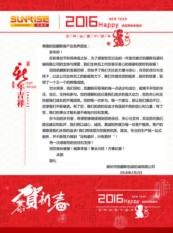 - 一元復(fù)始,萬象更新!值此新年元旦到來之際,廊坊市凱麒斯包裝機(jī)械有限公司向公司全體員工、廣大新老客戶及...